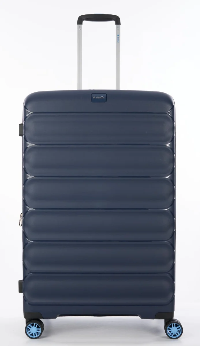 Moderní ultralehký plastový kufr 66 cm italské značky Dielle v modré barvě s prolisy proužků.