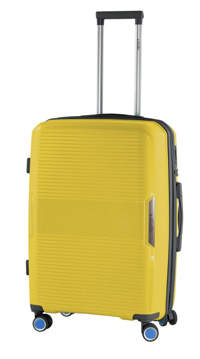Moderní ultralehký plastový kufr 67 cm italské značky Dielle ve žluté barvě s prolisy proužků.