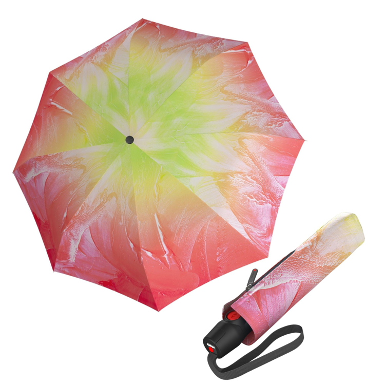 Knirps T .200 medium duomatic art sun - elegantní plně automatický deštník Když bude pršet, stane se deštník Knirps T.200 Duomatic vaším ideálním společníkem. Díky praktickému automatickému otevírání a zavírání, příjemné hmotnosti a ochrannému pouzdru na zip je kompaktní a pohodlný. A díky mnoha desénům existuje vhodný deštník pro každý vkus. Možná vás přesvědčí i skoro metrová střecha pod kterou se snadno schováte. Díky 3dílné konstrukci středové tyče je skládání kapesního deštníku velmi snadné a deštník lze bez problémů odložit do kabelky. Využitím vysoce kvalitních materiálů (ocel, hliník a sklolaminát) a preciznímu zpracování se T.200 stal jedním z nejodolnějších deštníků v našem sortimentu a snadno vydrží rychlost větru až 150 km/h - testováno v aerodynamickém tunelu. Informace o produktu: barevně sladěný ochranný kryt se zapínáním na zip robustní hliníková tyč s 20procent větší tloušťkou stěny trojdílné vzpěry usnadňují skládání deštníku extrémně hladce běžící funkce Duomatic (automatické otevírání/zavírání deštníku) s vynaložením o 30procent menší námahy stříbrný rám zvětšené profily kolejnic pro maximální stabilitu v jakémkoli směru větru pohodlné automatické otevírání a zavírání stisknutím tlačítka praktické pouzdro se zapínáním na zip nejstabilnější kapesní deštník v nabídce extra velké tlačítko pro pohodlné ovládání