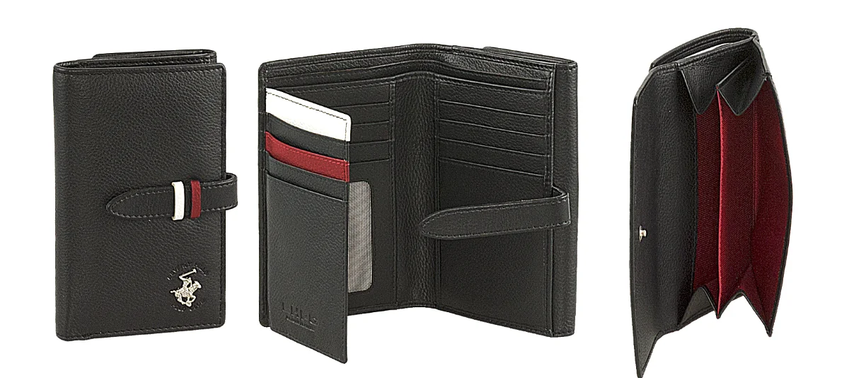 Dámská kožená peněženka značky Beverly Hills Polo Club série Loop v oblíbené černé barvě. Stylová dámská peněženka Beverly Hills Polo Club BH-1350 je přesně ten typ doplňku, který vypadá nenápadně luxusně a zároveň dává smysl v každodenním provozu. Kvalitní černá kůže, kontrastní červeno-bílé detaily a ikonické logo značky dávají jasně najevo, že tohle není žádná laciná náhražka. Uvnitř najdete přehledné členění s dostatkem prostoru pro platební i věrnostní karty, doklady a bankovky. Samostatná přihrádka na mince se zapínáním udrží drobné tam, kde mají být – žádné chrastění po kapsách. Praktické zapínání na druk zajišťuje, že peněženka drží tvar a obsah zůstane bezpečně uvnitř.