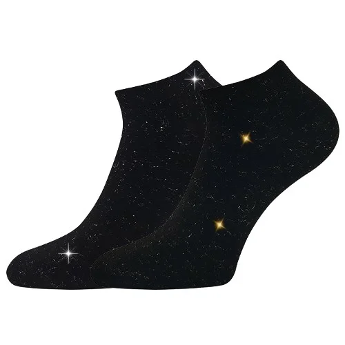 Bambusové ponožky Lonka® BIRGIT sú dámske nízke ponožky na každodenné použitie. Bambusová viskóza je prírodný materiál s prirodzenými antibakteriálnymi a antialergickými vlastnosťami, mäkké a hodvábne vlákno je príjemné na dotyk a pokožku a dobre absorbuje vlhkosť. Kvalitné ponožky majú mäkký a hladký povrch vďaka 200-ihlovému úpletu. Špička je uzavretá retiazkou, takže nikde netlačí, a pigue lem je mäkký, neťahá. Jednofarebné slabé krátke ponožky sa predávajú v balení po 2 pároch, každá ponožka je iná - trblietavá vďaka striebornej a zlatej lurexovej niti.