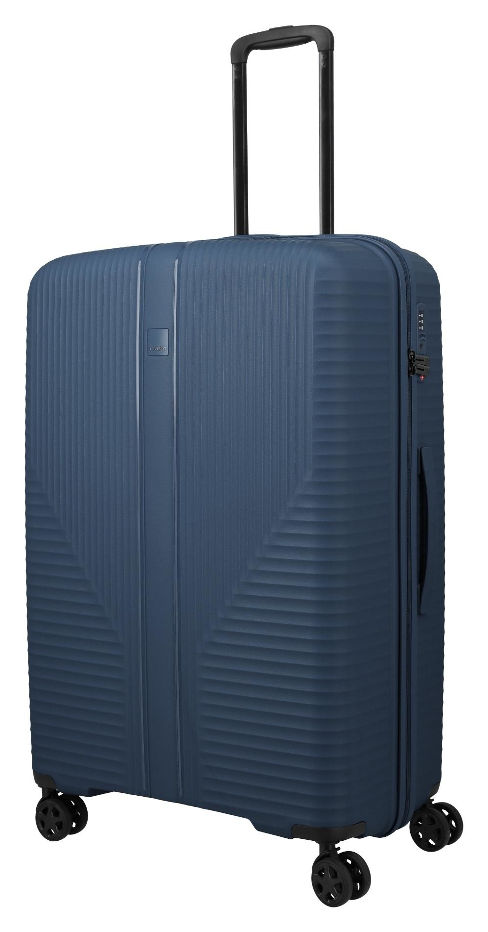 Prostorný skořepinový kufr z polypropylenu, vybavený čtyřmi kolečky a TSA zámkem.