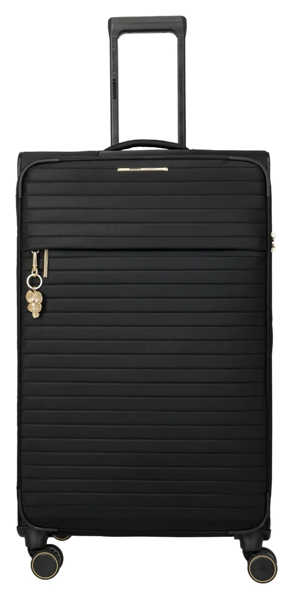 Luxusní velký čtyřkolečkový textilní dámský kufr s integrovaným TSA zámkem, jmenovkou, vyjímatelným obalem na boty, pouzdrem na šperky a stylovou klíčenkou vyrobený z recyklovaného nylonu a polyesteru.