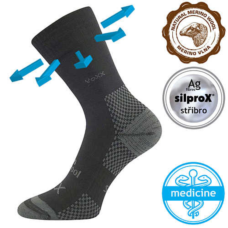 - dámske a pánske športové ponožky z merino vlny, s polstrovanou froté stielkou, špeciálny mäkký, nekrčivý lem, reťazová špička, antibakteriálna ochrana s iónmi striebra v materiáli silproX, teplotná trieda C