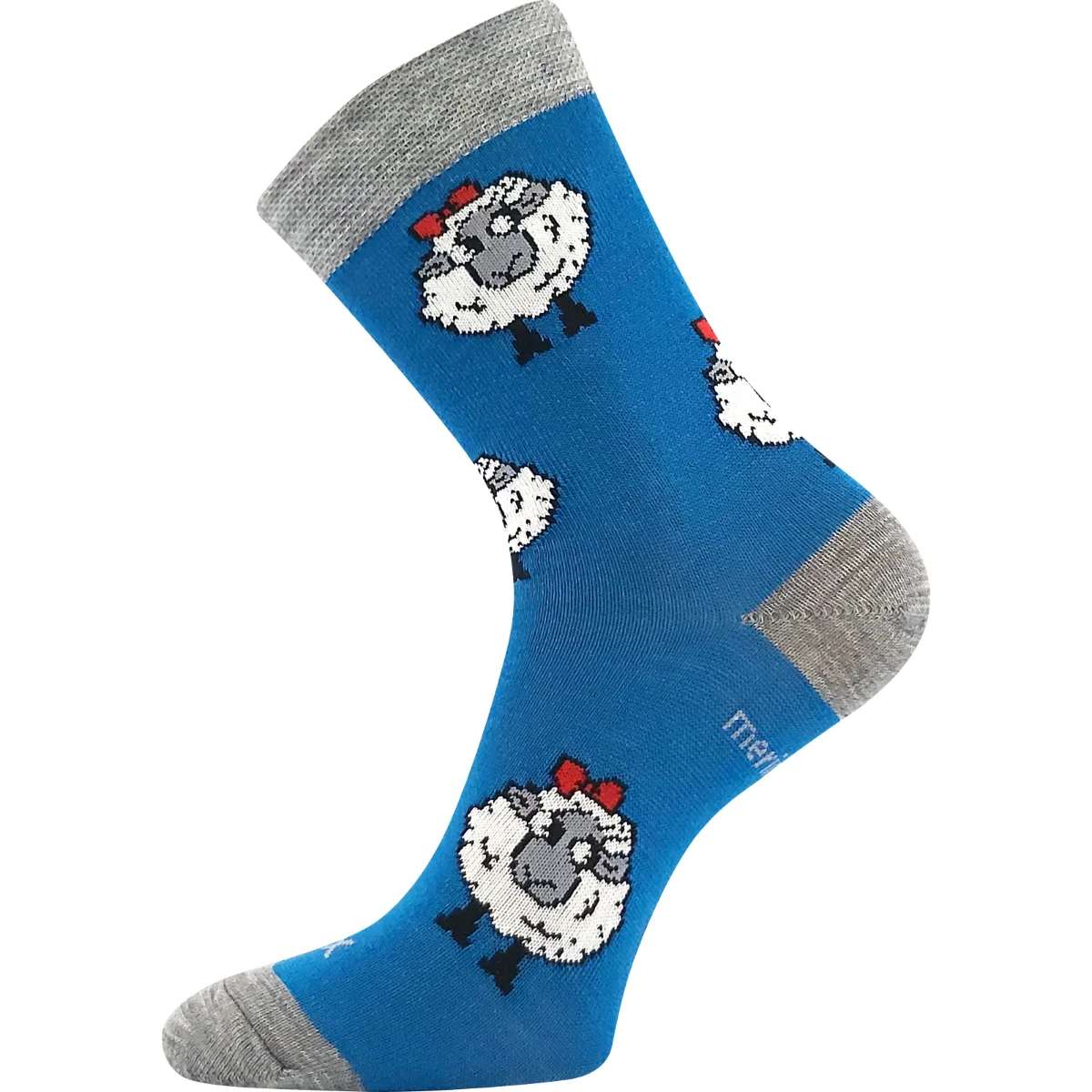 Dětské slabé ponožky VoXX® VLNĚNKA s roztomilými obrázky oveček vtipně odkazují na materiál, ze kterého jsou upletené. Nejjemnější merino vlna je doplněná navíc o ionty stříbra v materiálu silproX®.